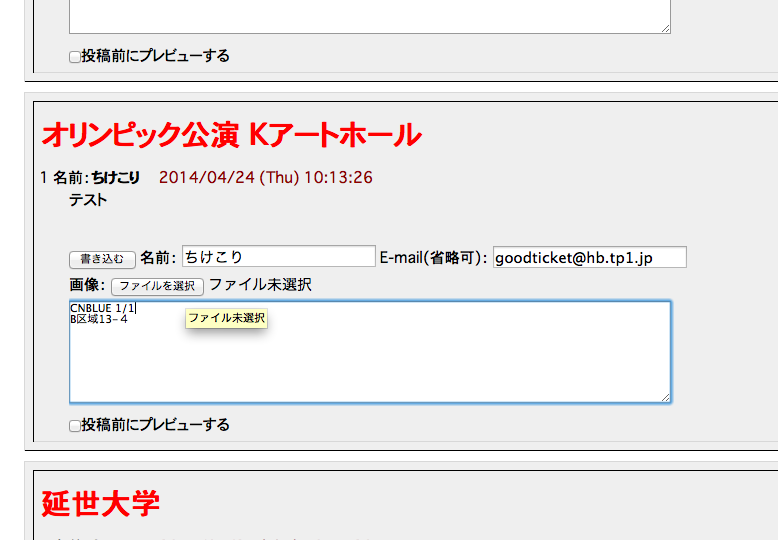 クリックすると拡大されます先ず、掲示板にアクセス。http://goodticket.bbs.fc2.com ・したら、該当する公演会場をクリックそこに必要事項を書き込み、写メをアップするだけ。 ・後は送付されたチケットに同封したネームカードに従って送信するだけ。